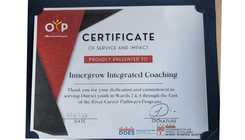 Our private sector counterpart, Innergrow Integrated Coaching LCC was recognized with a Certificate of Service and Impact (see photo on the left) by the DC Department of Employment Services for its work with youth, assisting them with work readiness training, financial literacy education, life and career coaching. We are honored by this recognition, and the opportunity to serve our young people living in the underserved neighborhoods in our nation’s capital.